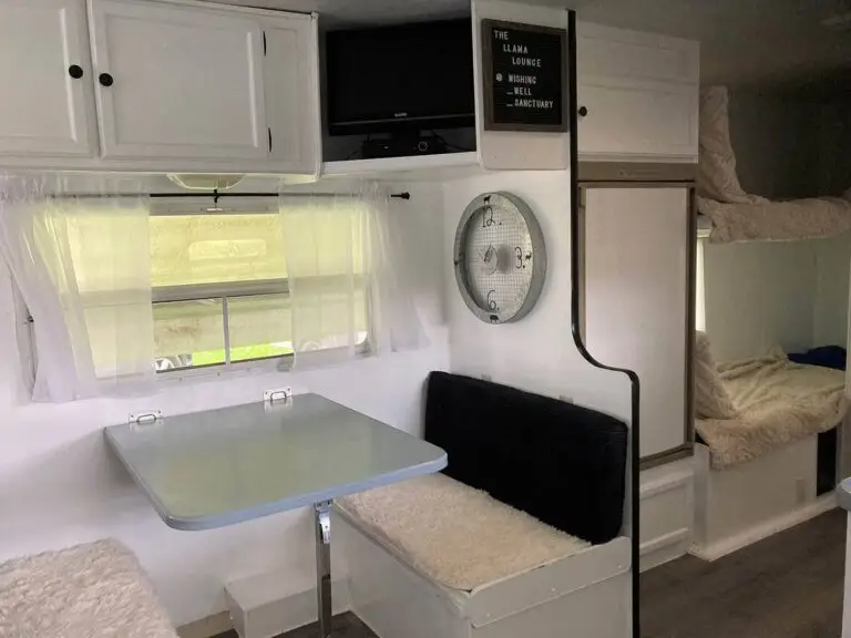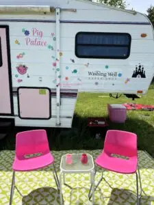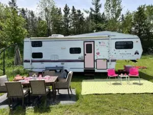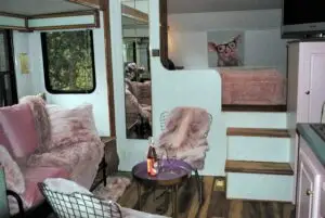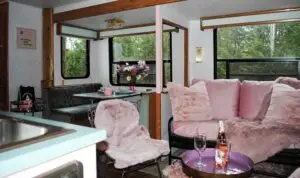 Our gorgeous trailer has a queen size bed, fold down bed, bunk beds and space to relax and watch a movie, or play a game.