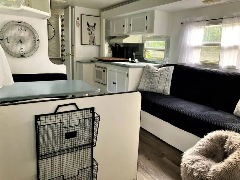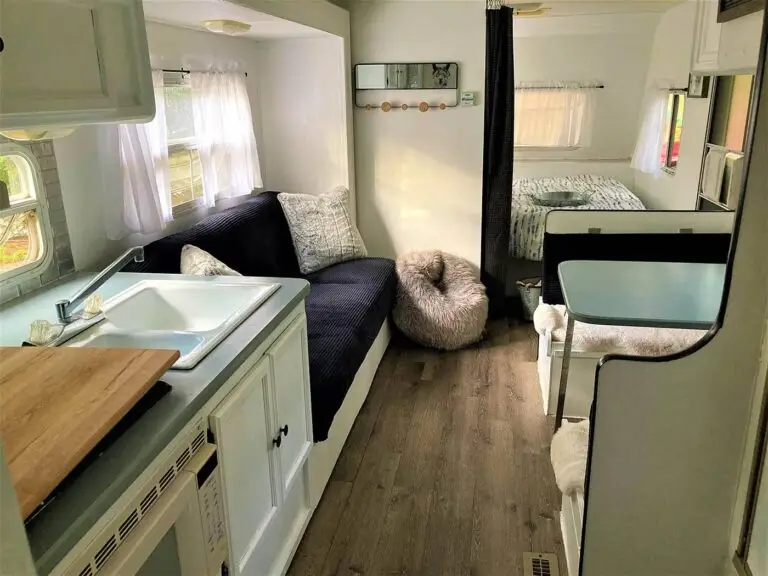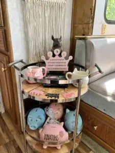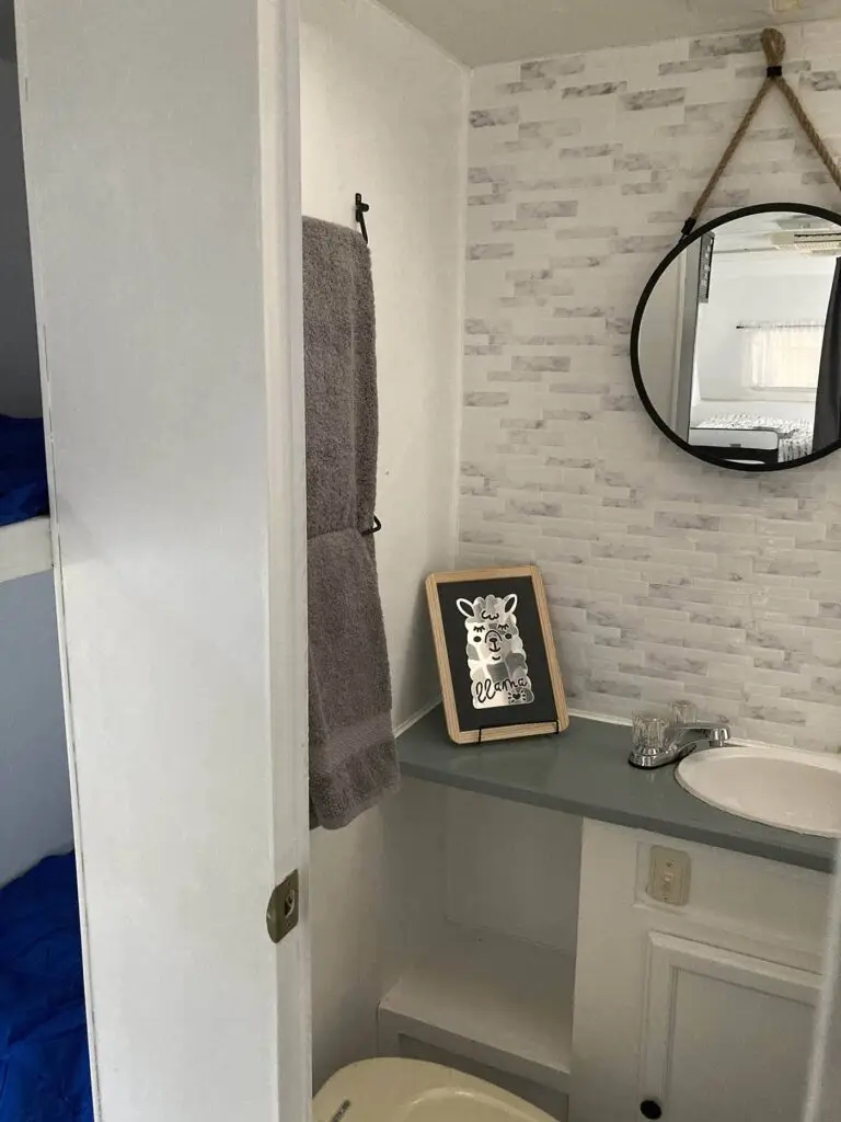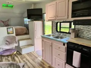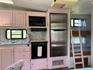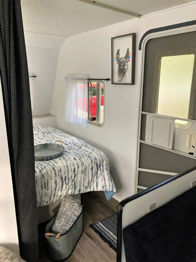 Our farmhouse style 27ft trailer has plenty of space for your family, including a queen size bed, fold down sofa and bunk beds. It has all the comforts of home!